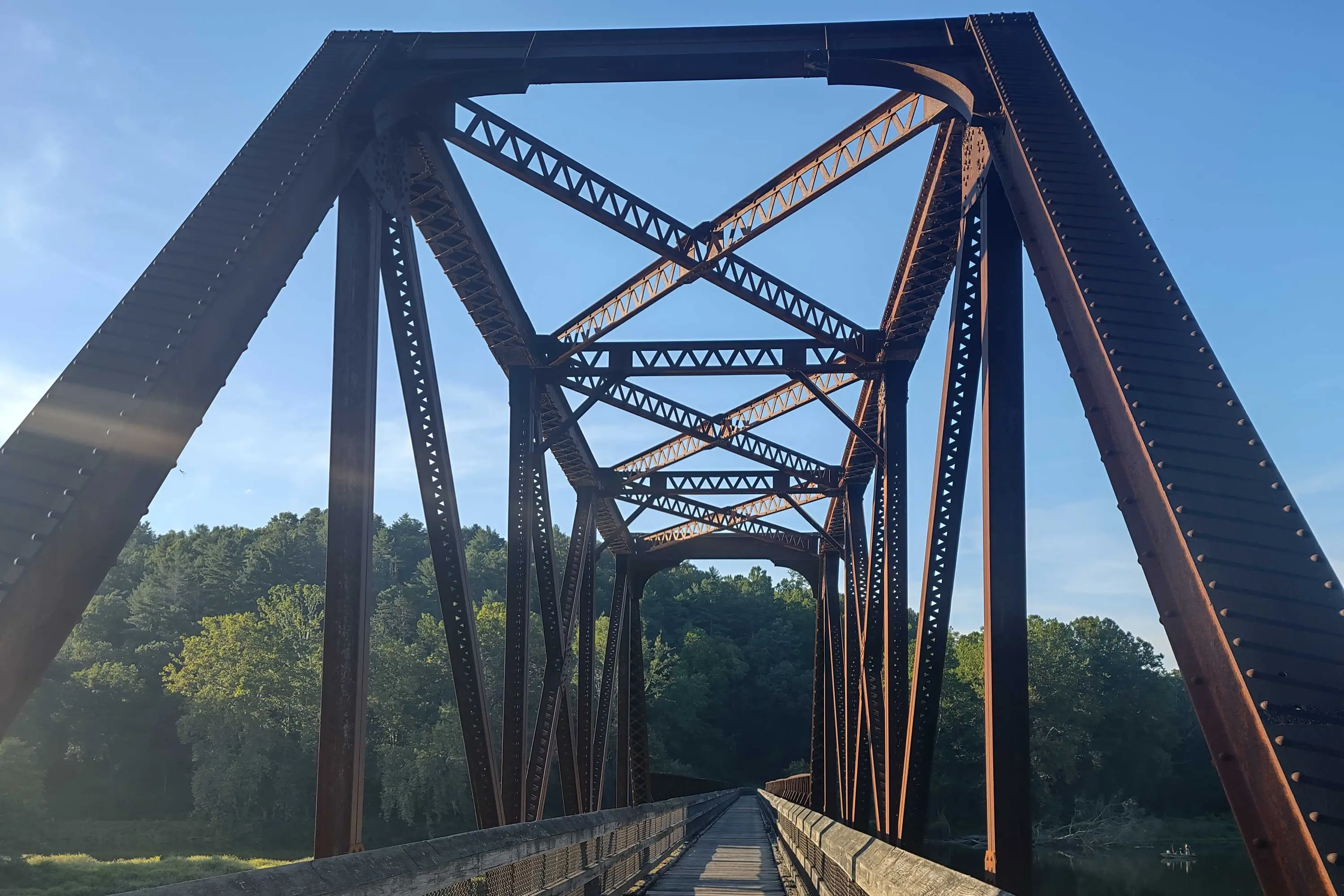 Last week I took a day to ride a long stretch of the New River Rail Trail from Fries, Virginia to Galax, Virginia. I had never ridden this particular stretch of the trail before and wanted to see what the trail was like between Fries and the large bridge that takes the trail over the New River. The trailhead at Fries was well maintained and the trail from there to the bridge provides excellent views of the river. The bridge itself is starting to show its age, loose boards and wobbly side-railings and all.