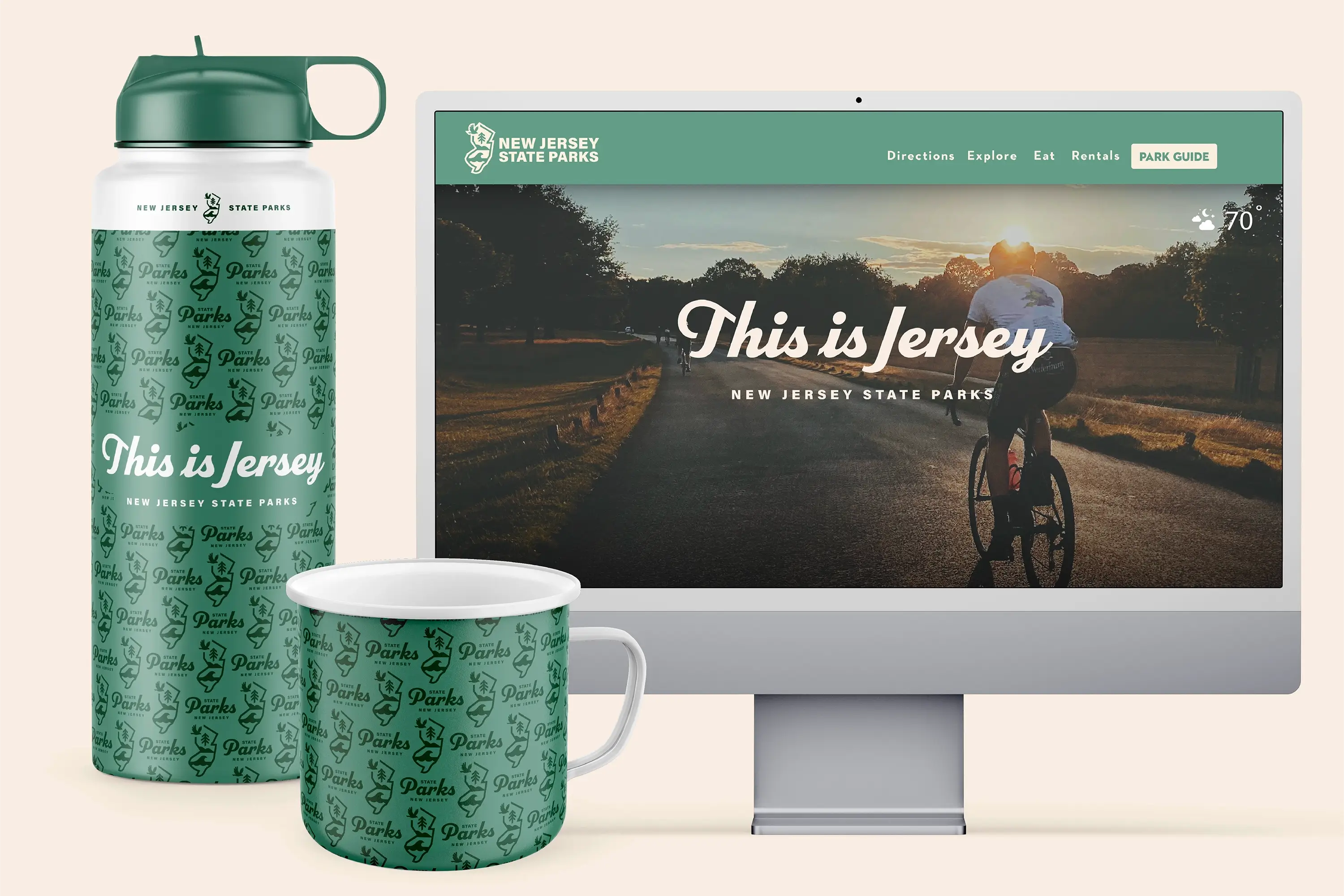 Our signage solutions were designed to be practical and buildable, respecting site-specific constraints and available resources, while ensuring the brand translated seamlessly from digital to physical environments. The result: a cohesive, flexible system that empowered NJSP to launch its new brand with clarity and impact, from gateway signs to trail markers and water bottles to t-shirts, and positions the parks as a key part of the state’s and nation’s heritage.
