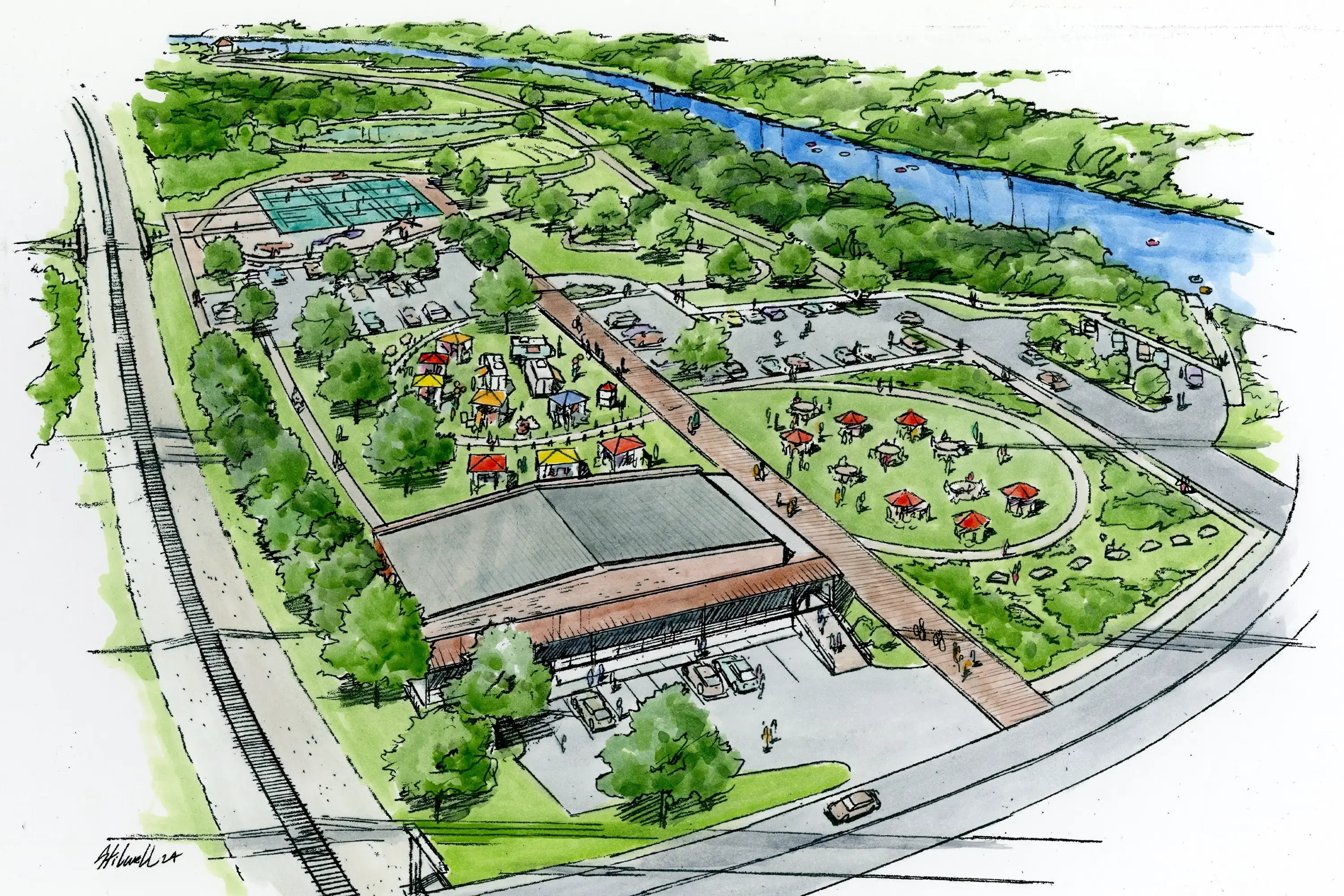 Early plans include transforming one of the historic warehouses through a public-private partnership to bring new life into the space and anchor an expansive community green — a place where farmers markets, concerts, and town events can thrive. The park will also feature walking trails, pickleball courts, and direct access to the river.